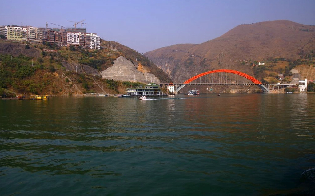 小三峽是針對長江的大三峽而言的,它位于重慶巫山縣境內(nèi)。長江在進入巫峽時,有一條名為大寧河的支流流入,形成一個比較寬敞的江面。巫山縣城就處在大寧河流入長江的入口處,是一座搬遷后新建的小城。從下面望去,不大的城區(qū)依山傍江,錯落有致。導(dǎo)游介紹說,新城是廣東援建的,主要街道就命名為廣州街。