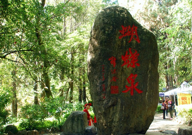 公園以“蝴蝶泉”而聞名。蝴蝶泉是一個(gè)方形潭,占地約50平方米左右,池中泉水清澈,泉底鋪著鵝卵石,水從白沙中涌出,還不時(shí)冒著氣泡,四周砌有大理石欄桿。“蝴蝶泉”三字為郭沫若所題。版權(quán)所有山東聊城聊之旅國(guó)際旅行社有限公司,轉(zhuǎn)載必究!泉被兩棵粗壯彎曲的百年合歡樹(shù)濃陰覆蓋。蝴蝶泉公園內(nèi)種有鳳尾竹、圣誕樹(shù)等林木,泉后的松林、柏林、棕櫚林、茶林、杜鵑林、毛竹林,蝴蝶泉邊合歡樹(shù)、酸香樹(shù)、黃連木等本地特有的芳香樹(shù)種。據(jù)說(shuō)以前每年農(nóng)歷三四月,云弄峰上的百花齊放,泉邊的大合歡樹(shù)散發(fā)出一種清香,這種清香吸引著成千上萬(wàn)只蝴蝶從四面八方飛來(lái),在蝴蝶泉四周飛舞。蝶大如巴掌,小如銅錢,呈黃、紅、白等七彩,品種多達(dá)上百種。無(wú)數(shù)蝴蝶還勾足連須,首尾相銜,一串一串的從大合歡樹(shù)上垂掛至水面,五彩繽紛,甚為奇觀。