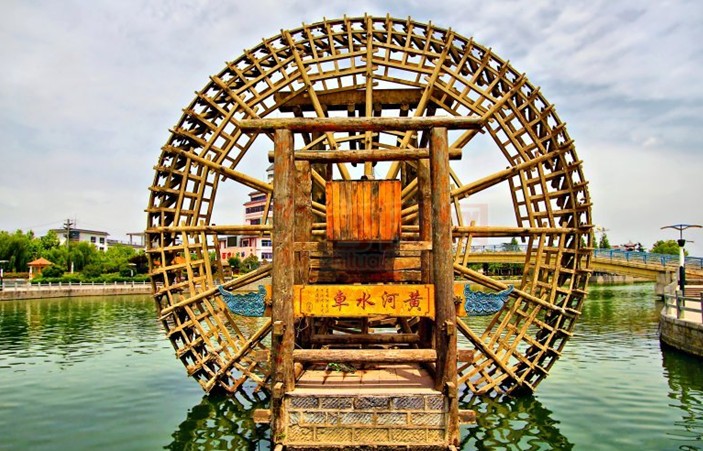 黃河水車幾百年來,世事滄桑,水車在原有引流灌溉的主要功能上,同時附加了豐富的旅游內涵,我們所看到的龍灣水車是1999年為發(fā)展石林旅游而重新修建的,水車有48個水斗,輻條36根,軸心到地面是7.8米,水車直徑為8米,它利用水流推動掛水板,驅使水車徐徐轉動,水斗依次舀滿水,緩緩上升,至上方時,水斗口朝下,將水傾倒掌盤,再入水槽,引流水渠。