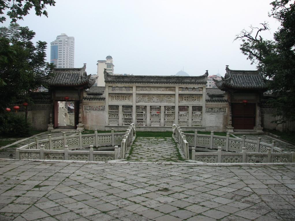 左右兩排石欄將第二進大院分為前后院,前院正中有一半月形水池,稱為“泮池”;池上正中有一小石橋,稱為“圜橋”。池畔均繞以石欄,石欄上刻有空花果品。石橋雖小,卻也拱有三個橋孔,頂懸有獅頭。從泮池橋上望去,在兩米高的臺基上,又有一座雄偉壯觀的石雕花牌坊巍然挺立,坊楹上刻有“欞星門”三個大字,在它的前面左右坊門腳下,各鋪有七級垂帶踏跺。它的坊柱上刻有八仙,坊欄上鏤有戲文以及展現(xiàn)過去讀書人功成名就的畫面,氣氛濃烈,構(gòu)圖細(xì)膩,生動逼真。在欞星門兩側(cè),各有一硬山頂建筑物,稱為“節(jié)孝祠”和“名宦祠”。 經(jīng)欞星門,便到了文廟的第三進大院,亦是由方形石板鋪地,呈長方形。院子的左右兩端,各有一棟重檐歇山頂建筑物,造型相同,左面的為“奎文閣”,右面的尊經(jīng)閣已毀。