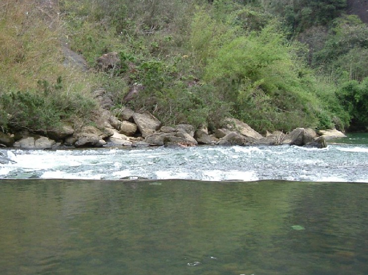 由臥龍?zhí)?,向北至古錐灘,為四曲。四曲勝景是隔溪對峙地兩座巍巍巨巖,東為在藏峰,西為西釣臺。然大藏峰橫空盤立,倒影碧波,飛翠流霞。巨巖、幽洞、深潭。是大藏峰的三絕。西釣臺臨溪而立,形如一仙翁在溪邊垂釣。主要景點有:大藏峰、仙釣臺、御茶園、小九曲等。