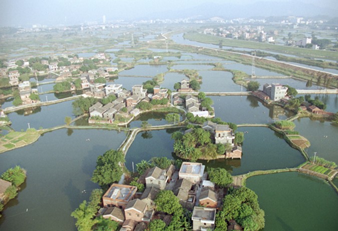 古勞堤內(nèi)水網(wǎng)縱橫交錯,小艇穿行如梭,兩岸蕉林搖曳,萬畝魚塘似明鏡耀目,千頃桑地綠海翻波,那青青的田疇就像精雕的翡翠,好一派旖旎的南國水鄉(xiāng)風(fēng)光。