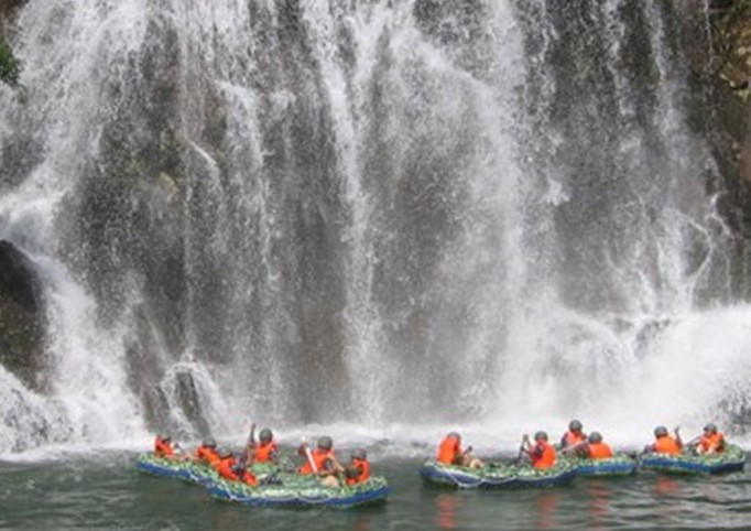 游客一進(jìn)入景區(qū),即置身于戰(zhàn)爭年代硝煙彌漫的烽火氛圍,游客換上專用的野戰(zhàn)軍服,組成一個個戰(zhàn)斗小分隊(duì),在戰(zhàn)斗分隊(duì)長(導(dǎo)游)的帶領(lǐng)下,坐上披滿迷彩的運(yùn)兵車,沿著充滿革命根據(jù)地氣息的曲折而平坦的深山林道向戰(zhàn)地指揮部(起漂點(diǎn))行進(jìn)。車上,戰(zhàn)斗分隊(duì)長向戰(zhàn)友們(游客)布置本次行動的任務(wù),分析敵情,并作宣傳鼓動,領(lǐng)唱戰(zhàn)歌,高叫口號,使士氣空前高漲。經(jīng)過十分鐘的行進(jìn),軍車到了目的地,在響聲震耳的瀑布聲中,更聽到了隆隆的炮聲,密集的槍聲,沿著峽谷峭巖古道而下,到了設(shè)在原始的飛天大瀑布旁邊的戰(zhàn)地指揮部,戰(zhàn)地參謀向戰(zhàn)友們訓(xùn)話并講述了戰(zhàn)斗要點(diǎn)和注意事項(xiàng)(漂流的有關(guān)常識),然后次序坐上戰(zhàn)船順流而下(開始漂流)。