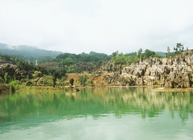 該類景觀典型的喀斯特地貌,表面呈虎皮狀。在這里,群峰壁立,奇峰危石,可謂千姿百態(tài),石門、石寨、石柱等,酷似人工堆疊,卻無人工痕跡;飛禽走獸的石頭,栩栩如生、惟妙惟肖;田園阡陌、炊煙裊裊,清泉碧池,清麗若未施粉黛的閨秀楚楚動人。顯示出萬盛石林景觀的美感與靈性。