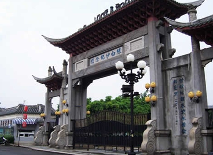 陳白沙祠在江門市郊白沙村,始建于明萬歷十二年(1584年),已成為江門市首屈一指的歷史文化品牌。1985年,江門市政府撥款大修陳白沙祠并辟為陳白沙紀念館,成為知名的旅游景點。祠內(nèi)正中為陳白沙塑像,旁有用白沙手跡刻的匾聯(lián)和碑刻。門前木石結(jié)構(gòu)牌樓,立面三間,四柱三樓。樓上有檐,檐下有玲瓏致密的斗拱、枋椽及精美的瓦面雕飾,是廣東現(xiàn)存的精巧明代牌樓。
