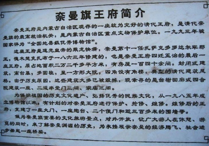 奈曼王府坐落于內(nèi)蒙古自治區(qū)通遼市,始建于清同治二年(公元1863年),為全國重點(diǎn)文物保護(hù)單位。占地面積9997平方米,有房屋190余間,系臺榭回廊式四合建筑。原為奈曼部首領(lǐng)札薩克多羅達(dá)爾漢郡王的府邸,現(xiàn)已對公眾開放.