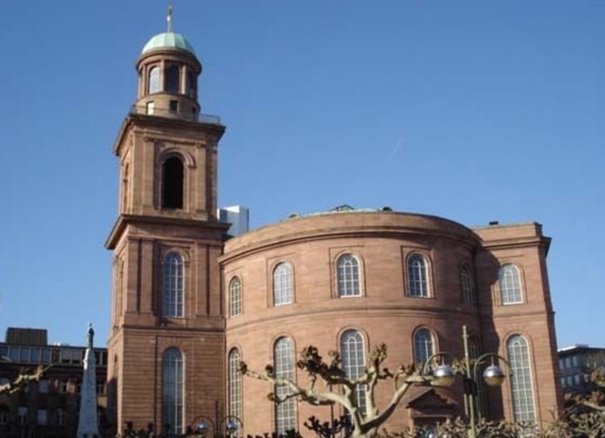 保爾教堂(Paulskirche)又譯圣保羅教堂(St. Paul's Church)坐落于德國法蘭克福,始建于1787年,是一座橢圓形的新教教堂,是德國重要的政治象征符號。是當(dāng)時(shí)為了取代方濟(jì)各會(huì)教堂(赤腳修士的教堂)(Barfüsserkirche)由該市建筑大師約翰`安德烈亞斯`李卜哈特(Johann Andreas Liebhardt)所設(shè)計(jì)的。1833年,這座雄偉的古典砂巖教堂終于落成。