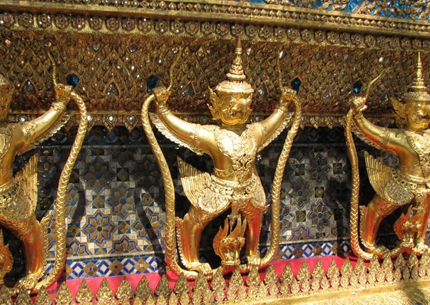泰國玉佛寺位于曼谷大王宮的東北角,是泰國最著名的佛寺,也是泰國三大國寶之一。建于1784年的玉佛寺是泰國大王宮的一部分,面積約占大王宮的1/4。玉佛寺是泰國王族供奉玉佛像和舉行宗教儀式的場所,因寺內(nèi)供奉著玉佛而得名。寺內(nèi)有玉佛殿、先王殿、佛骨殿、藏經(jīng)閣、鐘樓和金塔。玉佛殿是玉佛寺的主體建筑,大殿正中的神龕里供奉著被泰國視為國寶的玉佛像。玉佛高66厘米,闊48厘米,是由一整塊碧玉雕刻而成。每當換季時節(jié),泰國國王都親自為玉佛更衣,以保國泰民安。每當泰國內(nèi)閣更迭之際,新政府的全體閣員都要在玉佛寺向國王宣誓就職。每年5月農(nóng)耕節(jié)時,國王還要在這里舉行宗教儀式,祈禱豐收。寺內(nèi)四周有長約一公里的壁畫長廊,上面繪有178幅以印度古典文學《羅摩衍那》史詩為題材的精美彩色連環(huán)畫,并附有泰文譯詩。玉佛寺內(nèi)的幾塊大瓷屏風上彩繪著中國《三國演義》的故事。