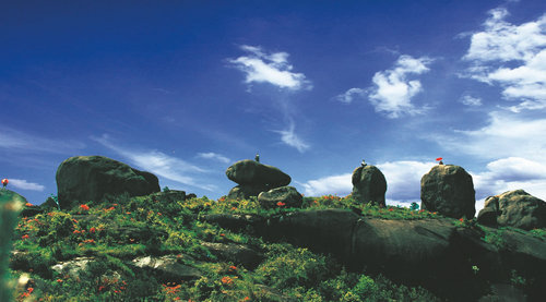 怪石:在海拔700-900米的山間怪石密布,似兔、似龜、似馬、似蛇、似海獅、似大象、似船、似流水、似瀑布、似岸灘,場面壯觀,形成了石的海洋;更有巨巖拔地而起,猶如上天云梯插入云霄,有的山嶺如黃山奇峰險峻異常;也有巨石支點巧妙可人為彈動,別具風(fēng)趣;又有巖石如溪中?步惟妙惟肖,趣味橫生,確實是一座天然石雕庫。能群觀,可獨賞;能遠(yuǎn)眺,可近看,觀感各異,意境深遠(yuǎn),使游者尋味無窮。只要身臨其境,無不浮想聯(lián)翩感嘆大自然的鬼斧神工, 使對玉蒼勝景情有獨鐘者不禁發(fā)出“桂林山水甲天下,玉蒼石海甲神州”的贊嘆。