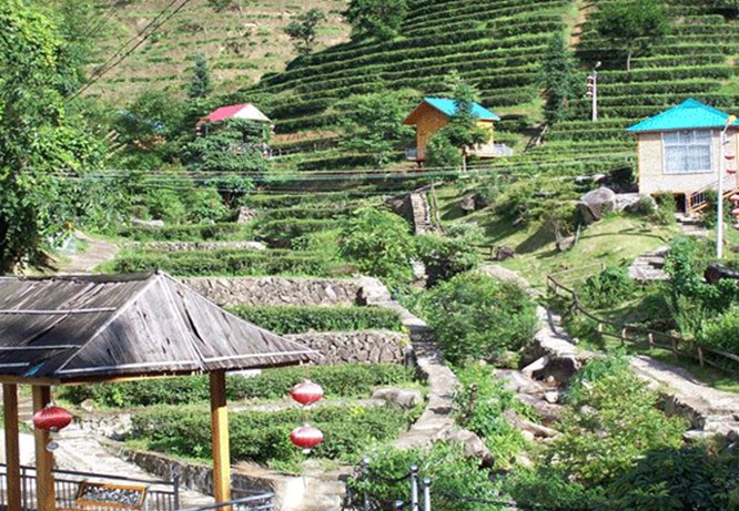7、西巖山北坪:位于崗頭村西側(cè)1km處,這里是當(dāng)年抗日時(shí)期劉永生北江縱隊(duì)扎營(yíng)的地方,也是楓朗鎮(zhèn)的茶業(yè)專業(yè)村。這里有山峰、民居、茶樹(shù)梯田景觀,因山坡陡而長(zhǎng),梯田的級(jí)數(shù)有30級(jí)之多,讓游客震撼。