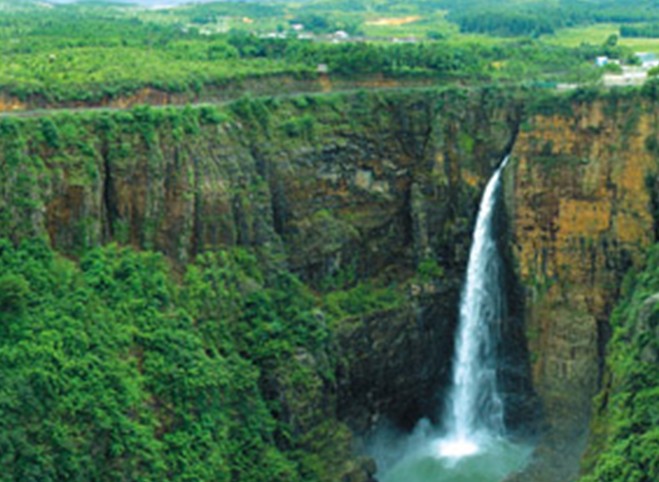 峽谷頂部地貌平緩,壺口瀑布從200多米的懸崖峭壁飛流直下,形成了氣勢磅礴的山水奇觀。另有一條坡度達50度斜角的1386級石階的“通天梯”可達谷底。峽谷溝壑縱橫,奇峰林立,古木參天,構(gòu)成一幅巧奪天工的山水畫卷。