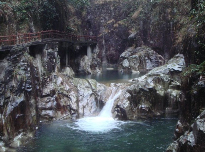 這是進(jìn)入公園大門后的第一個(gè)景區(qū)。蓮池,顧名思義池中生長(zhǎng)著睡蓮和各種各樣的蓮花,池岸婉然曲折,“荷花出淤不生塵,蓮葉如蓬睡美人。水榭瑤臺(tái)多雅韻,拱橋望月夜來(lái)新。”是蓮池映月的最好的寫照。徒步往大門后左側(cè)山坡沿小徑向上攀登,進(jìn)入一片以木蘭科樹木組成的香花林。一路上花香陣陣,使人陶醉。靜坐林中小亭,體味一種遠(yuǎn)離塵囂的感覺,便覺得不枉此行。香花林下山腳一片平緩山坡是森林燒烤場(chǎng),遙遙聽見潺潺水聲,聞聲溯源,原來(lái)是蓮池之水源頭。一簾瀑布從天而降,飛珠濺玉,名為鵑山響水,有詩(shī)云:兩峽溝深坡峭陡,龍?zhí)镀俨柬戜?。鵑花開放紅如血,杜宇啼痕月一彎。在這一景區(qū)還設(shè)有山泉游泳池,水涼而鮮,是夏天游客望而心動(dòng)的所在。