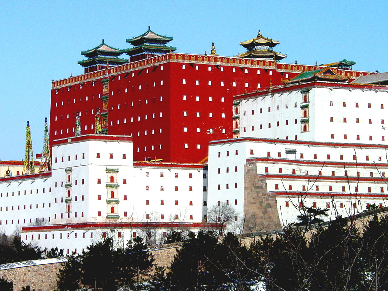 普陀宗乘之廟是仿西藏拉薩布達(dá)拉宮修建的,“普陀宗乘”是藏語“布達(dá)拉”的漢譯。廟依山建造,坐北朝南,山門內(nèi)是碑閣,北是五塔門,版權(quán)所有聊城聊之旅國際旅行社有限公司,轉(zhuǎn)載必究!高十余米,有拱門三個,上建紅、黃、黑、白、綠五座喇嘛塔。門北是琉璃牌坊。牌坊北地形漸高,各式白臺、塔臺建筑因地形而散置,高低有別,變化多端。最后為雄偉高大的主體建筑大紅臺。大紅臺的正面,下面是高達(dá)十八米的大白臺,其上聳立著高達(dá)二十五米的大紅臺。紅臺內(nèi)四周為三層群樓,中央是重檐攢尖鎏金銅瓦項的“萬法歸一”殿?!∑胀幼诔酥畯R布局分三個部分:前部包括山門、碑亭、五塔門;中部包括琉璃牌坊、白臺、僧房等;后部是主體建筑大紅臺及周圍其他建筑,大小共60余處,被包圍在雉堞銜連、依著山勢起伏而環(huán)寺一周的高大圍墻之內(nèi)。