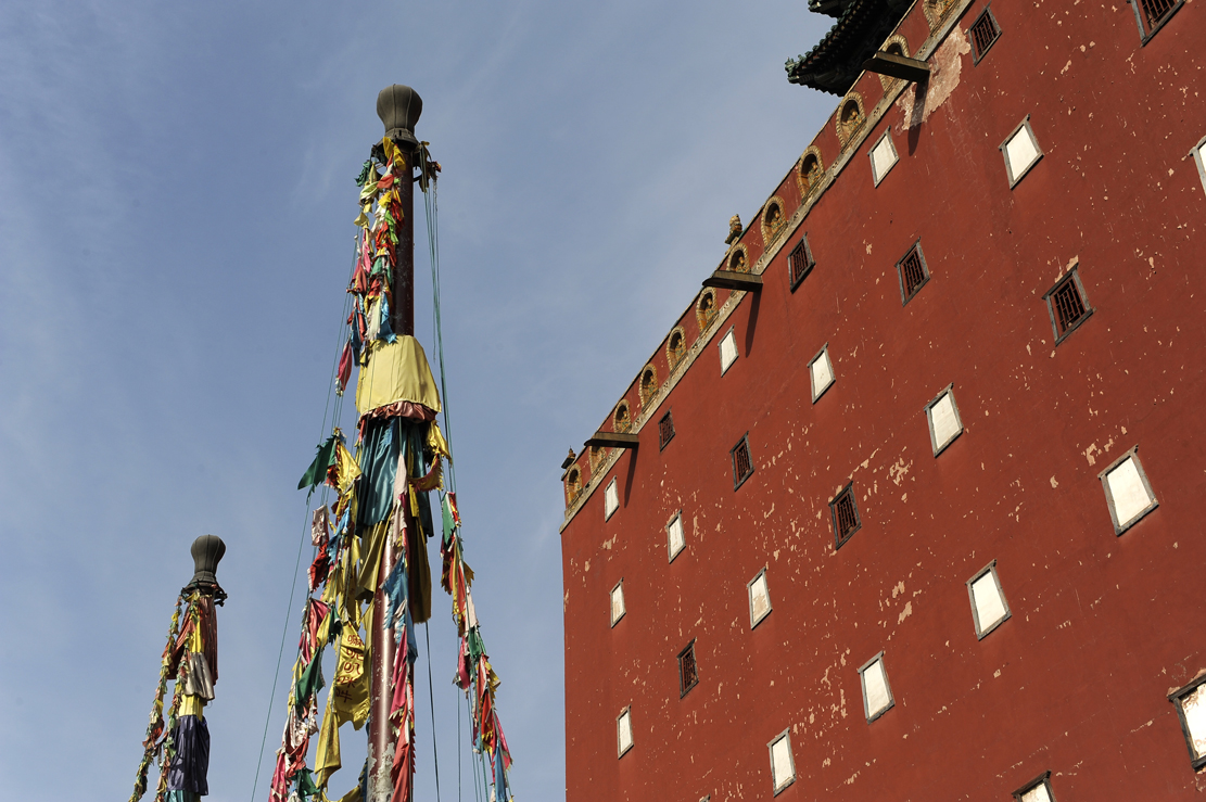 琉璃牌坊北為罡子殿,四面砌藏式雕房高墻,墻面設(shè)三層盲窗,東、南為一層僧房,西砌蹬道,北面僧房頂起廡殿,單檐綠琉璃瓦頂,面寬五楹,進深兩間,內(nèi)供吉祥天母、四面護法神、大梵天。罡子殿東為東殿,亦稱東罡子殿,平面成“乙”形,兩層。此殿原為僧房,現(xiàn)供五尊密宗無上瑜伽密樂空雙運雙身修法像歡喜佛。東側(cè)從北至南依次是金剛佛母、大威德金剛、密聚金剛、勝樂王金剛、惡度金剛。密宗歡喜佛造像一般都是多頭,表多智,最頂部為本像,余為變像;多臂多足,表大力多能;腳踩妖怪,表能降妖鎮(zhèn)魔。罡子殿西北一套院為西殿,亦稱西罡于殿,是經(jīng)堂,平面成“廠”形,正南辟門,北房兩層,硬山灰瓦頂。內(nèi)供主尊吉祥天母,原在權(quán)衡三界殿供奉,文革后移此殿展出。吉祥天母為鎦金銅質(zhì)造像,高116公分,身騎騾子,前后有兩個獸頭人身的小型造像,版權(quán)所有聊城聊之旅國際旅行社有限公司,轉(zhuǎn)載必究!底盤為大海。全組造像用紅銅1196斤,黃金57兩,用工6425個。據(jù)《吉祥天母經(jīng)》記載,吉祥天母為觀音變像,是達(dá)賴?yán)锏淖o法神,每年大年初一她騎著太陽下界巡視天下各方,驅(qū)除妖魔,保佑眾生平安。藏區(qū)佛教徒每年藏歷十月十五日都要把吉祥天母像從大召寺抬出游行示眾,以保人事平和,風(fēng)調(diào)雨順。吉祥天母像西供長壽佛九尊,藥師佛12尊,均為銅質(zhì)。