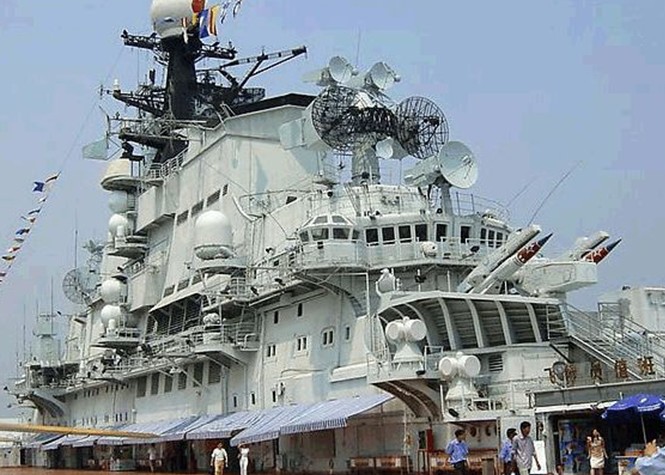 飛行甲板(第一甲板):艦首區(qū)有SS-N-12艦艦導(dǎo)彈,SA-N-3導(dǎo)彈,RBU- 6000反潛深彈,76mm火炮,SUW-N-1反潛導(dǎo)彈;艦橋區(qū)有多種雷達(dá)和電子戰(zhàn)武器;飛機(jī)區(qū)停放著1架前蘇聯(lián)米格-23殲擊機(jī),2架前蘇聯(lián)米-24 武裝直升機(jī)及強(qiáng)-5戰(zhàn)機(jī);艦尾有拖曳式場納1部,艦炮2門;另還有儀仗隊(duì)表演以及艦首高射機(jī)槍等。