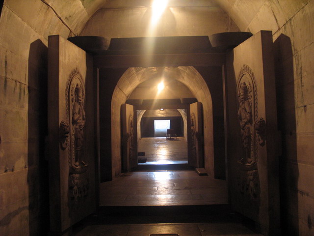 盡管清廷的遺臣為修建崇陵費盡心思,光緒還是沒有能夠在他的地下寢宮里平安地長眠下去。1931年軍閥混戰(zhàn)時期,一伙不明身份的兵匪盜掘了崇陵地宮,多數(shù)隨葬品被劫走。1980年6月,經(jīng)上級批準,清西陵文物管理處開啟地宮,清理整修,供國內(nèi)外游客參觀。這座地宮墓道全長63.19米,是無梁無柱的石拱券式建筑,共有四道石門、九座券。門樓、門垛、門框、門簪均用青白石作原料,雕有瓦脊、瓦壟、花瓶等圖案,每道石門上都有巨大的銅鑄門管扇,八扇石門上分別雕有八大菩薩立像,金券內(nèi)有寶床,寶床正中有金井,光緒皇帝和隆?;屎蟮墓讟⊥7旁趯毚采?,棺槨周圍有用五彩繪制的龍山石16塊,寶床前東西各有石座兩個,座上有香箱,是存放“冊”、“寶”用的。這座地宮雖已被盜,但仍出土珠寶玉翠等文物數(shù)百件。