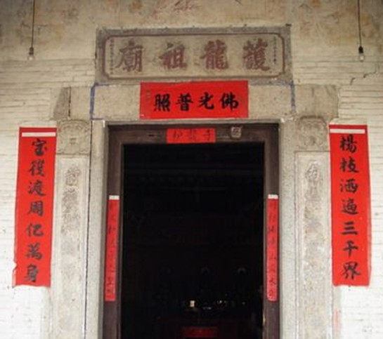 護(hù)龍祖廟在端州區(qū)黃崗鎮(zhèn)前村,始建于清初,同治十年(1871)重修。四周古樹懷抱,環(huán)境清幽,有小溪潺潺流過,廟前遠(yuǎn)眺,田園秀色一覽無遺。廟為三進(jìn)院落四合院式布局,面積136平方米,大門上方鑲嵌楷書“護(hù)龍祖廟”石匾,前后殿為硬山頂,面寬進(jìn)深均三間,建筑物前設(shè)“低頭牽”,抬梁與穿十混合式梁架結(jié)構(gòu),兩殿之間以平面方形的卷棚頂廟亭相連,亭兩側(cè)空地邊緣,還用矮墻連貫前殿與后殿,使之渾然一體。
