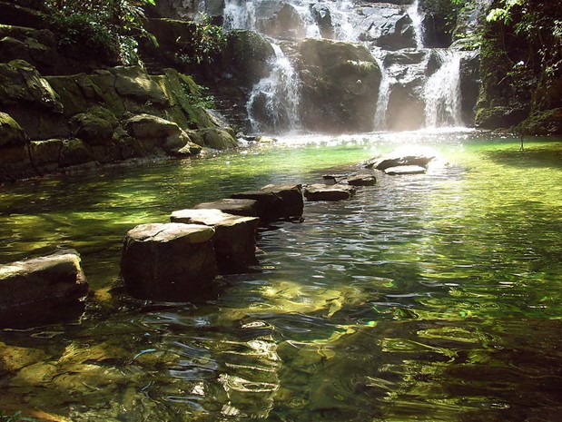 鼎湖山飛水潭,又名龍?zhí)讹w瀑,位于鼎湖山南半山腰、慶云古剎下東側。 去飛水潭,由榮睿碑亭拾級登山,沿曲徑云封直上,至半山腰向右拐,過眠綠亭即可。當然,亦可在榮壑碑亭前面的山溪邊起步,一直溯溪而上。這里,山石嶙峋,瀑布從40多米高的崖頂深處狂奔而來,直往下飛瀉,忽而形成千尺飛流,如白練懸空,忽而濺作滿空雨花,如輕紗曼舞。瀑布下,如注的水流匯成一泓碧水,中有巨石,上刻“枕流”2字。辛亥革命后,孫中山先生偕夫人宋慶齡游覽鼎湖山時,曾在此游泳,現(xiàn)崖壁上刻有宋慶齡手書的“孫中山游泳處”6個大字。潭水由此再往下傾瀉,版權所有山東聊城聊之旅國際旅行社有限公司,轉載必究!繼而形成另一個深潭,據(jù)傳為蟄龍窟,故曰:浴龍池。飛水潭側建有更衣室,崖間建有觀瀑亭,崖壁鐫刻著許多贊美飛水潭的摩崖大字和方寸小楷,如“噴雪”、“能移我情”、“天然圖畫”、“飛泉咽危石”等,頗有詩情畫意。 夏日到此,觀瀑、游泳、濯足,均感遍體清涼,煩熱頓消。