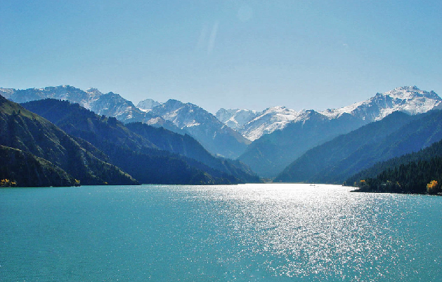 天池東南面就是雄偉的博格達(dá)主峰(蒙古語(yǔ)“博格達(dá)”,意為靈山、圣山)海拔達(dá)5445米。主峰左右又有兩峰相連。抬頭遠(yuǎn)眺,三峰并起,突兀插云,狀如筆架。峰頂?shù)谋ǚe雪,閃爍著皚皚銀光,與天池澄碧的湖水相映成趣,構(gòu)成了高山平湖綽約多姿的自然景觀。