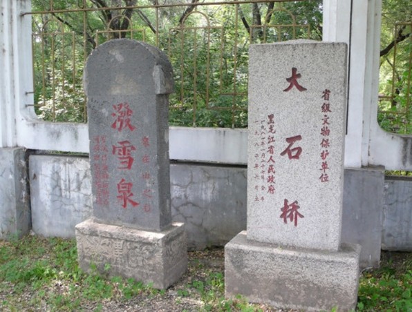 位于寧安市區(qū)西雞陵山下,橫跨大溝壑上。為清代通向遼、吉要道。此橋?yàn)楹邶埥貐^(qū)僅有的清代石拱橋。橋東有潑雪泉,泉水流入溝壑,經(jīng)大石橋,南注牡丹江。始建于后金天聰八年(1634年),原系板筑;后改石筑,為單曲拱大橋,全長25米,寬4.5米,高7.3米.橋面鋪石,兩側(cè)設(shè)石欄桿,上雕刻石桃,欄間嵌有刻成草葉紋和云卷紋飾的石板。建國后曾進(jìn)行維修。