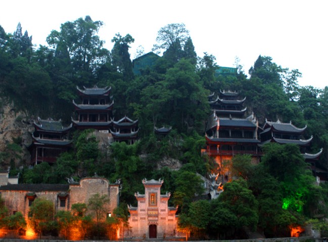 青龍洞背靠青山,面臨綠水,貼壁臨空,五步一樓,十步一閣,翹翼飛檐、雕梁畫棟。這些古建筑依山因地,與懸崖、古木、藤蘿、巖畔、溶洞天然合成,融為一體,真是巧奪天工。既有臨江遠(yuǎn)眺的吊腳樓,也有恬靜幽邃的寺院禪臺(tái),有朗朗書聲的學(xué)子院,更有鑼鼓喧天的戲臺(tái),集天下山水樓閣薈萃為一方。