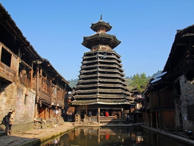 始建于清代康熙十一年(1672)秋。版權所有山東聊城聊之旅國際旅行社有限公司,轉載必究!該樓為木質結構,形如寶塔,雙葫蘆頂。高25米,占地面積160平方米。內(nèi)有4根大柱,每根直徑0•8米,高15米,每柱之間距離3.6米,構成椎形方架,是鼓樓的骨干部分。距4大柱外圍3米處,豎有8根高3.5米的支柱,將大柱團團圍住,并以穿枋與內(nèi)柱相連,呈輻射狀。一層樓上疊有數(shù)層,每層有8根短爪柱層層疊豎,直至第十一層。鼓樓頂部,還有兩層八檐八角的傘頂寶塔,名曰“干梗”,其工藝精細,為中國木質結構建筑中所罕見。在此層頂閣中,有一個長約3米,直徑約10公分的木鼓。最頂部嵌有陶瓷寶珠尖頂,直插云霄。頂閣下面各層梁上釘有橡皮,并用大小羊桃藤捶爛與石灰拌合架瓦,十分牢固。檐閣下畫有龍、鳳、魚、蟹、蝦等動物圖案,美麗壯觀。此樓的最低層嵌有3扇大門,正中設有一個火坑,周圍鋪青石片。該鼓樓為國家級重點文物保護單位。中國清代侗族建筑。在貴州省從江縣西北約50公里的增沖寨。據(jù)碑文記載,始建于清康熙十一年(1673),道光、光緒時曾維修。鼓樓系侗族特有的民俗建筑,是侗家聚眾議事、排解糾紛、迎送賓客、對唱大歌和吹笙踩堂等重大活動的場所。一般一姓建鼓樓一座,因此又是族姓的形象標志。增沖鼓樓既保存了中國古代建筑的特色,又具有濃厚的民族風格,規(guī)模宏大,造型美觀,工藝精湛,具有較高的價值。1988年中華人民共和國國務院公布為全國重點文物保護單位。1997年6月,國家郵電部曾發(fā)行《侗族建筑》一套四枚郵票,其中有一枚就是增沖鼓樓。由此可見增沖鼓樓在由數(shù)不清的鼓樓、花橋、戲臺和吊腳樓構筑的五彩繽紛的侗鄉(xiāng)建筑中所占的地位。