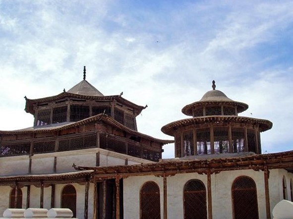哈密回王陵由墓群和艾提尕爾清真寺(兩部分)組成。墓群原有土木結(jié)構(gòu)的大小拱拜六座,埋藏著歷代回王及其王妃,現(xiàn)剩兩座,最大的拱拜(墓葬)為七世回王伯錫爾、回王福晉以及八世回王莫合買(mǎi)特及其王妃、王族等40余人的墓。該拱拜高17.8米,下部呈長(zhǎng)方形,東西長(zhǎng)20米,南北寬15米。上為穹隆頂,墓門(mén)兩側(cè)塔柱中空,有臺(tái)階盤(pán)旋而上,可至墓頂。拱拜南側(cè),有木質(zhì)亭式拱拜2座。東部一座為九世回王沙木胡索特拱拜;西部一座為臺(tái)吉拱拜。九世回王拱拜底部正方形,邊長(zhǎng)各15.5米,內(nèi)部以土坯壘砌伊斯蘭式的穹隆頂墓室,外部于垣墻內(nèi)及四周用亭柱支撐漢族亭樓木結(jié)構(gòu)的八角攢尖頂,建筑將墓室罩在其中,飛檐起脊,雕梁畫(huà)棟。這兩座木質(zhì)拱拜,版權(quán)所有山東聊城聊之旅國(guó)際旅行社有限公司,轉(zhuǎn)載必究!在建筑形式上,以伊斯蘭式的穹隆為基礎(chǔ),同時(shí)吸收了內(nèi)地八角攢尖頂及蒙古式盔頂?shù)哪举|(zhì)結(jié)構(gòu)建筑形式,將多種風(fēng)格融為一體,在新疆的伊斯蘭陵墓建筑,極具特色,是中原文化、蒙古文化和伊斯蘭文化相融合的產(chǎn)物。