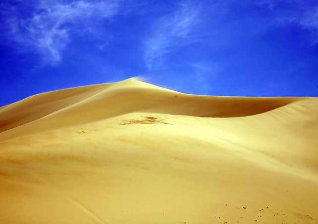 巴里坤鳴沙山位于新疆巴里坤哈薩克自治縣境內(nèi),西距縣城60公里,四周被豐美碧綠的草場(chǎng)所包圍,猶如湛藍(lán)大海中的一座金色小島。鳴沙山形似一朵蘑菇,高約百米,沙丘陡峭,其下有水泉,左右兩側(cè)有河流通過。據(jù)說這里是唐代女將樊梨花西征遇難的地方,聽到的沙鳴,就是女兵們當(dāng)時(shí)擂鼓助陣和沖殺鼓掌之聲。
