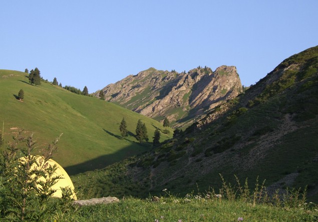 從烏魯木齊出發(fā),抵達(dá)大河沿后,租用越野車(chē)或卡車(chē)至五星牧場(chǎng)扎營(yíng)。這里就是徒步的起點(diǎn)。