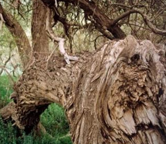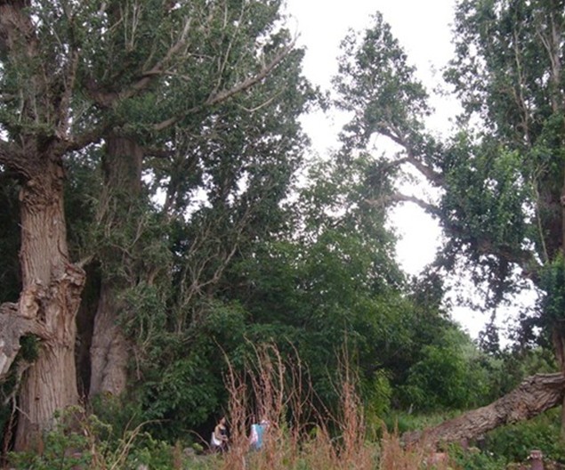 阿克蘇向北,過溫宿縣城后,再向西北行60公里,穿越一大片戈壁灘,一個崗巒起伏的小綠洲便展現(xiàn)面前。這個小綠洲,不是處在地勢低洼處,而是位于坡度平緩的崗阜上,海拔為1700米左右,面積僅0.4平方公里,但卻是郁郁蔥蔥,濃蔭覆蓋,流水潺潺,蜂飛蝶舞,堪稱人間仙景。當(dāng)?shù)胤Q它為“怪樹園”。被稱之為“圣水泉”的一汪清泉在綠洲頂部,涓涓細(xì)流,滋潤著這塊綠洲。