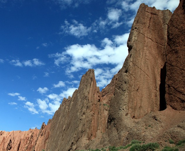 維吾爾語“克孜利亞”是“紅色的山崖”之意。神秘的“天山大峽谷”是天山支脈克孜利亞山中的一條峽谷,紅褐色巖石經(jīng)過大自然億萬年的風(fēng)刻雨蝕之下,才形成由現(xiàn)在“天山大峽谷”。“天山大峽谷”紅褐色的山體群直插云天,在陽光照射下,猶如一簇簇燃燒的火焰。“天山大峽谷”的迷人之處,不僅僅在于它的雄奇、險峻,而在于它的幽深、寧靜和神秘。站在谷底仰視高山,只覺得陡峭的峰巒似乎隨時隨刻都會壓下來,令人感到窒息、眩暈。