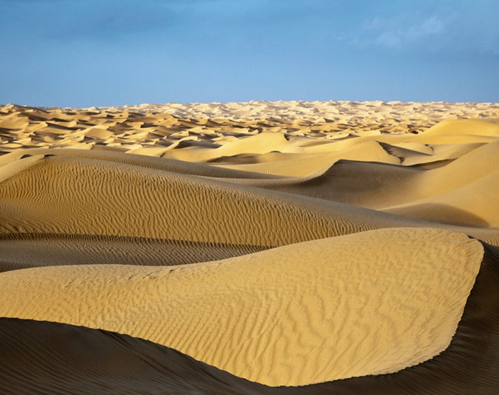 塔克拉瑪干面積33萬平方公里,為世界第二大流動沙漠。乘車于沙漠公路猶如蕩舟大洋,遺憾的是人們的視線過早落到地平線上。然而在塔克拉瑪干腹地海拔1413米的喬喀塔格山(紅白山)上眺望塔克拉瑪干沙漠,則是另一種的浩瀚。蒼茫天穹下的塔克拉瑪干無邊無際,它能于縹緲間產生一種震懾人心的奇異力量,令面對此景的每一個人都感慨人生得失的微不足道。在紅白山上看和田河的秋色,是一輩子不能忘懷的。和田河兩岸的胡楊在陽光下泛著濃厚的金黃,如寬大的金色絲帶纏繞著大地,從天際延伸過來,又蜿蜒消逝到天的另一盡頭。我們發(fā)現,要欣賞此景,恐怕塔克拉瑪干是惟一的。