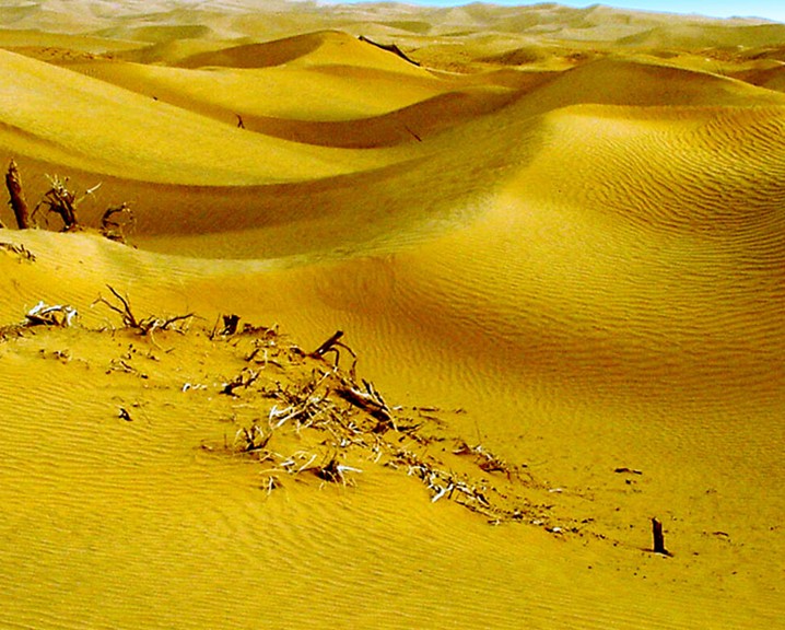 塔克拉瑪干沙漠位于中國新疆的塔里木盆地中央,是中國最大的沙漠,也是世界第九大沙漠,同時還是是世界最大的流動性沙漠。整個沙漠東西長約1000公里,南北寬約400公里,面積達33萬平方公里。平均年降水不超過100毫米,最低只有四五毫米;而平均蒸發(fā)量高達2500—3400毫米。這里,金字塔形的沙丘屹立于平原以上300米。狂風能將沙墻吹起,高度可達其3倍。沙漠里沙丘綿延,受風的影響,沙丘時常移動。沙漠里亦有少量的植物,其根系異常發(fā)達,超過地上部分的幾十倍乃至上百倍,以便汲取地下的水份;那里的動物有夏眠的現象。