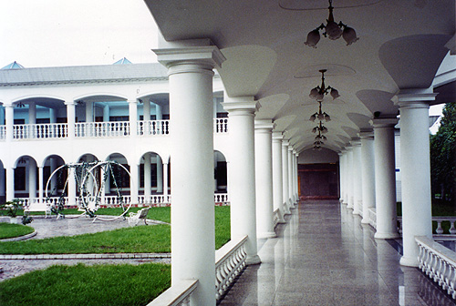 伊甸宮:一座中西合璧的建筑,中國傳統(tǒng)的庭院式與歐式建筑的線條、廊柱建筑風(fēng)格相結(jié)合。通長的圍廊,漢白玉石柱,具有良好的裝飾性和使用功能,使您的戶外活動不受氣