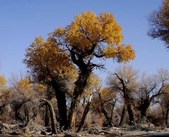 新疆維吾爾自治區(qū) 輪臺縣地處天山南麓、塔里木盆地北緣,這里有世界上面積最大、分布最密、存活最好的“第三紀(jì)活化石”——40余萬畝的天然胡楊林。胡楊林是塔里木河流域典型的荒漠森林草甸植被類型,從上游河谷到下游河床均有分布。雖然胡楊林結(jié)構(gòu)相對簡單,但具有很強的地帶性生態(tài)烙印。無論是朝霞映染,還是身披夕陽,它在給人以神秘感的同時,也讓人解讀到生機與希望。