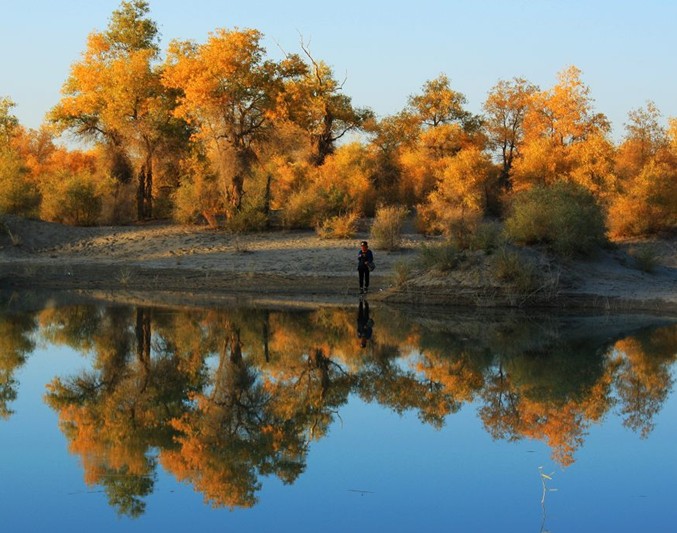 曠野上隨處可見輪臺油田高聳藍(lán)天的井架、排列齊整的鉆機和車隊以及井口噴射的朵朵烈焰,使昔日覺寂的荒原,充滿活力和生機。該公園現(xiàn)建有木頭賓館、磚砌的四合院接待站和食堂,可解決旅客的食宿。公園接待站后院高聳著一座二三十米高的了望鐵塔,登上塔頂,但見蔚藍(lán)的塔里木河蜿蜒曲折,散成眾多的汊流,汊流間布滿胡楊林。胡楊林海,順著塔里木河一直伸向茫茫天際,好不壯觀!森林公園色彩絢麗多變,綠樹、碧水、藍(lán)天,猶如一幅濃重的水墨畫。秋初黃綠相間,深秋一片金黃。公園中建有水榭、湖心亭,備有游船、汽艇可供開展巡河觀光。這里的河汊全長7千米,開始段呈長圓開如湖蕩,水中建有湖心亭,各種水鳥珍禽集隊飛翔鳴啼在湖面和森林中,湖中樹木倒影清晰,環(huán)境靜謐,空氣清新,漫步湖濱,令人心曠神怡;河汊中間段水面寬闊,汪洋一片,水波蕩漾,水中到處布滿奇開怪狀的枯樹與樹樁,船行其間猶如穿梭在梁山泊的水寨間,別有情趣,河汊末端水道收縮變窄,形成條條港汊,水流紋絲不動,水平如鏡,河汊兩邊的胡楊林連同藍(lán)天白云倒映水中,其影像比明鏡中的影子還要清晰逼真,令游人叫絕;河汊末端是蘆葦蕩和胡楊紅柳沙丘群,潔白的葦花蕩和胡楊紅柳沙丘群,潔白的葦花在逆光透射下發(fā)出誘人的銀白色光芒;牛、羊群悠閑地覓食在紅柳沙包中。登上沙丘頂,向南望,胡楊林一眼望不到邊;向北遠(yuǎn)眺,沙漠油井噴射的火焰映紅了藍(lán)天。這如詩如畫的美景迷倒了無數(shù)的游人,令人流連忘返,特別是那些攝影愛好者和畫家,在這里一住就是一周甚至半月。
