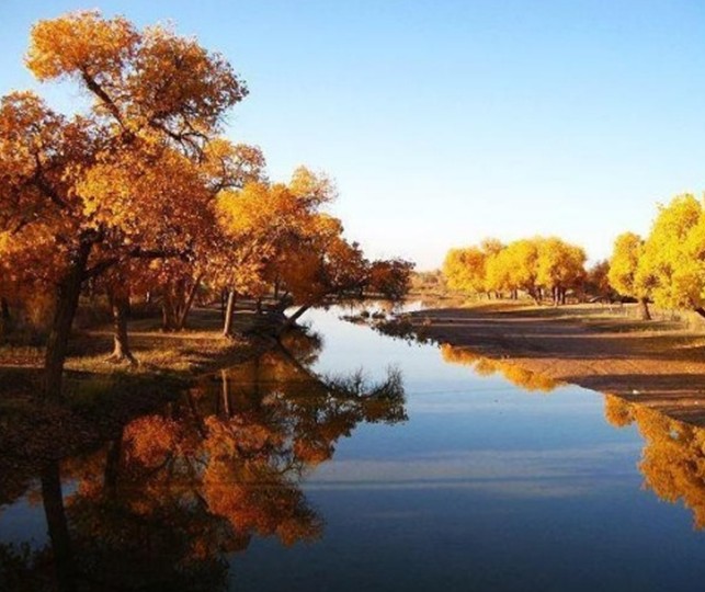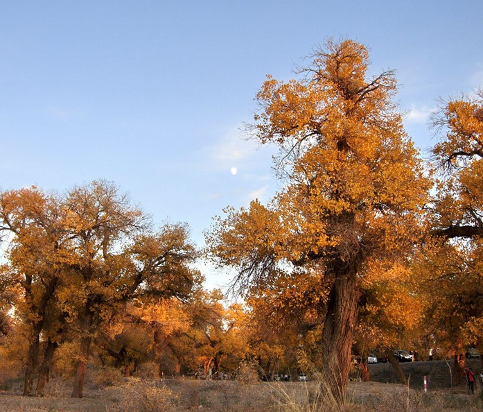 該森林公園位于塔里木胡楊保護區(qū)的核心部位,版權(quán)所有山東聊城聊之旅國際旅行社有限公司,轉(zhuǎn)載必究!地跨輪臺和尉犁兩縣交界處世哲的塔里木河中游河汊區(qū)域。由沙漠公路0千米前行駛13千米向東拐向一條筆直的石油公路。沿該路東南行沿途沙地中不時出現(xiàn)成簇、成片的胡楊風(fēng)景林,這里的胡楊樹粗壯、胸徑一般在60~80厘米,粗的可達(dá)1米,并常見有二三棵胡楊連體生長在一起的,其直徑粗達(dá)成1。6米左右,樹高一般5~8米,高者可逾10米。胡楊樹一般間距在20米左右,成簇生長的樹距只有3~4米。進得公園正門,首先映入眼簾的是3株合抱不交的古老的胡楊樹,游人無不在此駐足留步,下去瞻仰這3株奇特的樹。它們樹干內(nèi)部已空,而樹冠卻依然枝繁葉茂,投下大片綠蔭,遮去了似火的焦陽,人一看到這3株奇特的樹,就先來了精神,給人無限的飛夢,感到它才是生命之本,才是幻化的靈魂。3株奇樹左邊是一湖碧水,這是塔里木河自然瀉洪形成的一個小湖。近幾年,森林公園開辟后,來了4只白天鵝,以后又有數(shù)只飛來,它們一來就相中了這個地方,即使在冬季,也不肯離去,夏天在水中游戲,引頸放歌,冬日與人類共歡。湖水的周邊都是茂密的胡楊林,游人可在岸邊垂釣,湖中的魚之多,不時可釣出大鯉魚、黃花魚。公園的前邊野豬林,真正的野豬已早被嚇得逃遁了。你走進密林深處,卻有野羊、野鹿、野狐、野兔出沒其間,野草野花惹歡逗奇,野樹野果直撞人頭,野氣野味意味無窮,茂密的森林,往往使人望而卻步,高大的胡楊會使你爬上它的高枝,望遠(yuǎn)塔克拉瑪干大沙漠,森林和大漠的風(fēng)光頓時使你也野了。公園的右邊野鹿林無比的真,這里一切都是真的,真花真草,真樹真鹿,在都市里是無法看到的,幾個亭榭雖有雕琢的痕跡,但被它的真而溶化,在干旱沙漠腹地出現(xiàn)了這世外桃源,老樹抽新綠,新樹遍地長,野鹿和鳴,蝶飛蜂舞,你仿佛要返撲歸真,也想進入這森林中居住。在公園的東邊有一處西漢時期的墓葬,據(jù)考證,是漢朝官兵在此積谷屯田之時的遺跡,雖經(jīng)兩千多年變遷,但依然可以看出墓葬的規(guī)模。雖然幾百年前有盜掘的痕跡,但是依然保持了墓葬的原貌。沙漠胡楊林公園占地4.5平方公里,于1997年開園。隨著塔里木石油勘探開發(fā),無數(shù)的石油人日夜沐浴干旱風(fēng)沙,非常需要一個美好的憩息之地,休閑之地。由此石油人成了公園的??停饧畣T工對其更感興趣,輪臺、庫車、庫爾勒、喀什、烏魯木齊和不少的中外游客,版權(quán)所有山東聊城聊之旅國際旅行社有限公司,轉(zhuǎn)載必究!都千里迢迢地領(lǐng)略這大漠森林風(fēng)光。