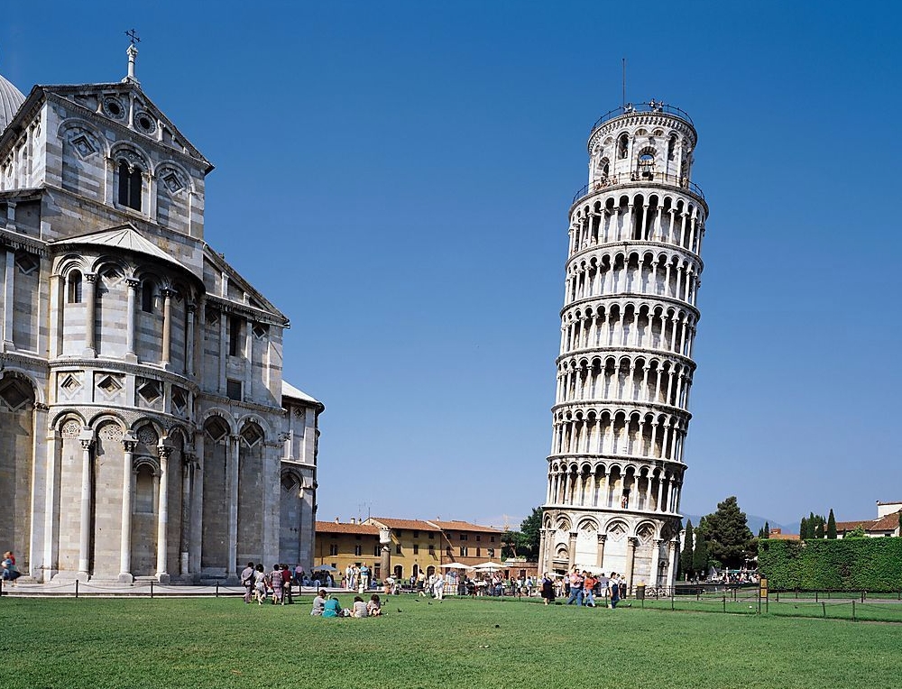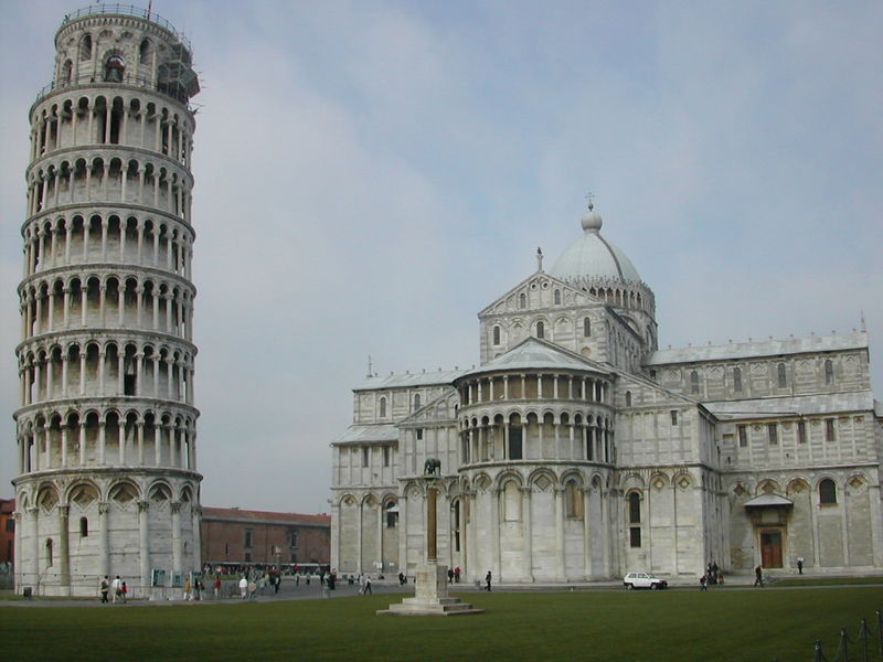 比薩斜塔(意大利語(yǔ):Torre pendente di Pisa或Torre di Pisa)是意大利比薩城大教堂的獨(dú)立式鐘樓,于意大利托斯卡納省比薩城北面的奇跡廣場(chǎng)上。廣場(chǎng)的大片草坪上散布著一組宗教建筑,它們是大教堂(建造于1063年—13世紀(jì))、洗禮堂(建造于1153年—14世紀(jì))、鐘樓(即比薩斜塔)和墓園(建造于1174年),它們的外墻面均為乳白色大理石砌成,各自相對(duì)獨(dú)立但又形成統(tǒng)一羅馬式建筑風(fēng)格。