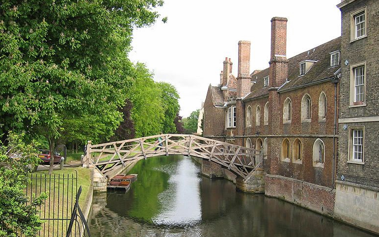 走進(jìn)皇后學(xué)院,可以見(jiàn)到一座古老的木橋橫跨于劍河之上,這就是舉世聞名的數(shù)學(xué)橋,又叫作牛頓橋。相傳牛頓采用數(shù)學(xué)和力學(xué)的方法設(shè)計(jì)并建造了這座橋,橋上沒(méi)有用一顆釘子。牛頓的學(xué)生認(rèn)為:牛頓老師能做到的事,牛頓的學(xué)生也能夠做到。他們把這座橋拆了,可是怎么也不能把這座橋不用釘子恢復(fù)成牛頓老師建筑的原樣,最后不得不用釘子才重新將木橋架好。這個(gè)故事是假的,因?yàn)閿?shù)學(xué)橋是在牛頓死后22年才建起來(lái)的。真正的情況是,該橋最早是用鐵釘連接,比較不明顯,但是現(xiàn)在新造的這座用的是螺絲。(不過(guò)這座橋似乎確實(shí)是被一名好奇的學(xué)生拆開(kāi)來(lái),然后再重新裝回去的)。