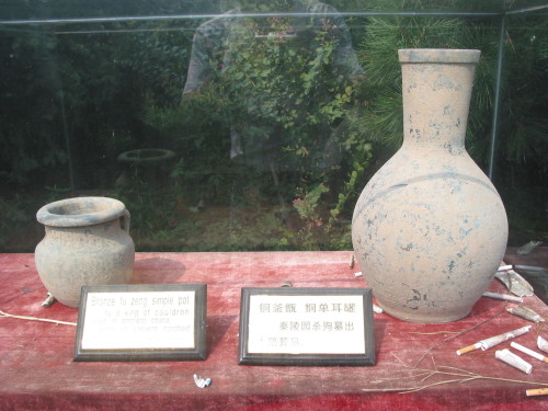 陵園地面建筑四周,有許多壁畫雕塑。南邊共有六組蠟像,集中反映了當(dāng)年修建秦始皇陵園的施工場(chǎng)面,而西邊七組玻璃鋼雕塑,則表現(xiàn)了秦先民建造秦宮殿的情景。