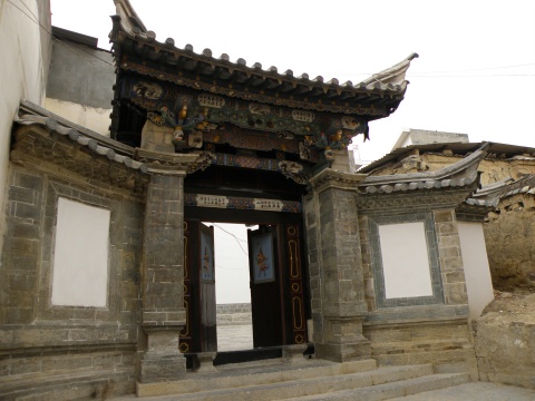 垂花門樓的大門,是瓦屋頂,三疊水式楹。門頭上方高懸著三重錯落有致、優(yōu)雅精美的檐枋,上面分別雕鏤出富有寓意的圖案:第一重檐枋上透雕出幾尾游魚和兩條金龍,寓意為“魚躍龍門”;第二重檐枋上鏤出朝陽和四只喜鵲,寓意為“四喜臨門”、“蒸蒸日上”;第三重檐枋上鐫刻著佛手、桃梨、香爐、寶瓶等物,象征著“福祿壽”。旁邊雕斗上鏤空的金馬、碧雞,寓意“金碧輝煌”。金馬、碧雞傳說是古代滇池邊的兩種神物,如今已經(jīng)成為云南的象征之物。 在大門前,有一對刻著龍鳳圖案的石鼓,據(jù)說兩個石匠花了一年的功夫才大功告成。兩個石匠把他們這件生命的杰作交給世人;朱氏家族用銀兩和心血留下了這幢華麗的建筑。