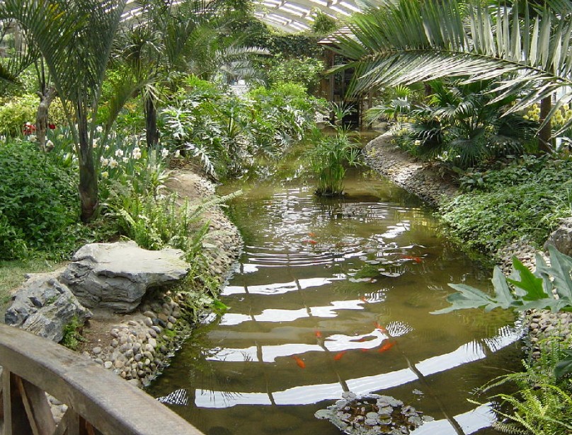 位于公園中部,溪流到此處寬狹不等,曲折多變。河兩岸群植竹、杉及灌木,河邊楊柳飄絲,南岸樹(shù)叢中隱現(xiàn)一只面積18.5平方米的竹亭。北岸有座呈直角形的綠蔭茶室,墻體為毛石砌就,外形樸素、粗獷,部分建筑伸出水面,有竹甬道與岸相聯(lián),建筑面積350.25平方米。室內(nèi)設(shè)裝飾壁爐,墻上懸掛獸頭鹿角,野趣盎然。景區(qū)南有座三孔石拱橋,長(zhǎng)13米,寬3.1米;橋上的花崗石亭面積10平方米。過(guò)橋向西有組蘑菇亭,混合結(jié)構(gòu),面積共30.6平方米,亭下配有石桌石凳。