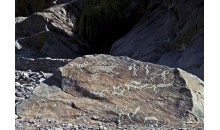 克爾堿巖畫位于托克遜縣庫加依鎮(zhèn)境內(nèi),南距鎮(zhèn)政府約4.5千米,巖畫散布在鎮(zhèn)北的克爾堿 溝兩岸,畫面內(nèi)容主要有:羊、牧羊人、鹿、狗、駱駝以及狩獵、放牧等場面。其中一幅水系圖令人注目。巖畫基巖均為侏羅紀粗砂巖。相傳有位神匠途經(jīng)此地,眼見四周環(huán)境優(yōu)美,于是整日靜坐在河岸欣賞,后將四周景色逐一刻畫于巖壁上,形成人們今天看到的巖畫。