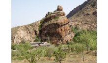 后召廟遼石窟寺位于巴林左旗林東鎮(zhèn)西南約25公里的峽谷中。石窟開鑿在谷內(nèi)南向的陡壁上,窟前有大殿,面闊7間,進深3間。窟分中、南、北三窟,均較完整。中窟正中為釋迦佛涅盤像,俗稱臥佛,佛像兩側(cè)有菩薩及弟子像,作痛哭流涕狀,形象逼真,惜已殘損。南窟刻有釋迦佛、文殊菩薩、普賢菩薩及力士像。北窟分南北兩小室,北小室雕像同于南窟,南小室的佛像兩下側(cè)方,刻有契丹裝束的供養(yǎng)人浮雕像,其旁浮雕力士像一對,面目猙獰,腳著長靴,頗有地方特色。