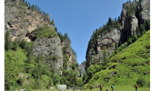 從卓尼縣城沿洮河向東,經“石媳婦”(矗立于洮河岸邊的一座石峰)、博峪楊土司衙門遺址,便到大峪溝口的多壩村,向南沿林區(qū)公路進大峪溝4公里,就到大峪河上的云江峽。云江峽猶如被縮小了的九巔峽,西壁高約百米,東壁高30~50米,峽長500多米,其間石峰嵯峨,石門如屏,蒼松翠竹葳蕤,河水清冽碧綠,鳥鳴枝頭,魚翔淺底,可謂一幅絕妙的圖畫。