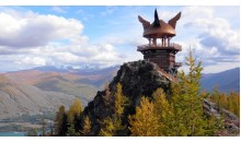 觀魚亭建于海拔2030米的哈拉開特(蒙古語意為駱駝峰)山頂上,與湖面的垂直落差達(dá)600多米,因處于觀察“湖怪”的最佳位置,故得名觀魚亭。去觀魚亭有兩條路可供選擇:一條是乘汽車從山后繞行到山腰;另一條是從湖出水口山前專為爬山者鋪設(shè)的石階盤旋步行而上。
