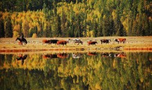 鴨澤湖位于禾木喀納斯蒙古族鄉(xiāng)境內(nèi)喀納斯村南邊,它是由喀納斯河改道后廢棄河段——牛軛湖洼地組成,呈長(zhǎng)形蝶狀,沿洼地南端形成一個(gè)南北走向的寬淺湖泊,形似蝶狀的一弘碧水與沼澤濕地連為一體,面積約1.3 平方公里。